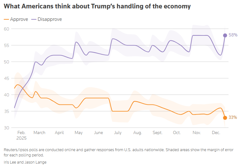 Trump’s approval rating slips to 39%, economy weighs, Reuters/Ipsos poll finds Jason Lange, Reuters President Donald Trump’s approval rating slipped in recent days to nearly its lowest level of his current term as voters from his Republican Party soured on his handling of the economy, according to a new Reuters/Ipsos poll. The three-day survey, which concluded on Sunday, showed 39% of U.S. adults approve of Trump’s job performance. Just 33% of U.S. adults said they approved of how Trump was handling the U.S. economy, the president’s lowest rating on the matter this year.
