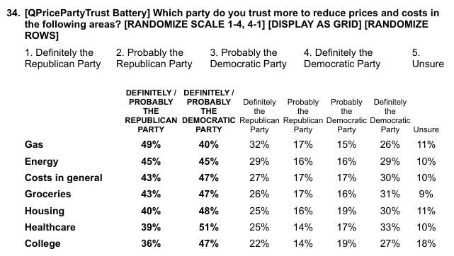 December 2025 Verified Voter Omnibus Echelon Insights • Donald Trump’s job approval stands at 45% approve, 55% disapprove • Democrats lead on the 2026 generic congressional ballot, 48-45 • 74% say only a decline in prices would convince them that inflation and costs are no longer a problem • Voters trust the Democratic Party more on reducing the prices of housing, groceries, healthcare, college, and costs generally; they trust the Republican Party more on reducing the price of gas; and they are split on who they trust on energy