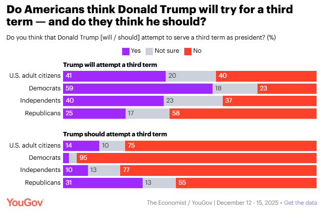 Few Americans want Donald Trump to attempt to serve a second term Taylor Orth and David Montgomery, YouGov Donald Trump’s job performance is up slightly this week, though more continue to disapprove than approve of his handling of the presidency. Many Americans describe Trump as bold, but also as dangerous and corrupt. Americans are split on whether Trump is too old to be president, but regardless of his age, very few are in favor of him seeking to serve a third term.