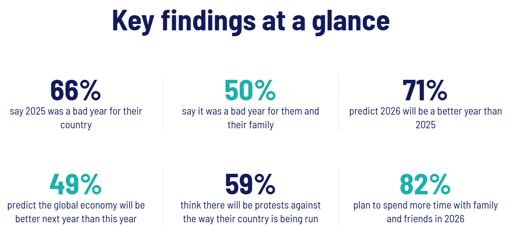 Majority plan to spend less on holiday gifts this year amid broader economic concerns Ben Kamisar, NBC News That includes two-thirds of those with household incomes under $50,000, according to the latest NBC News Decision Desk Poll. Ipsos Predictions Survey 2026 Ipsos The Ipsos Predictions Survey 2026 finds 71%, on average across 30 countries, think things will look up next year but people are split on whether the worldwide economy will be stronger (49%) or not (51%).