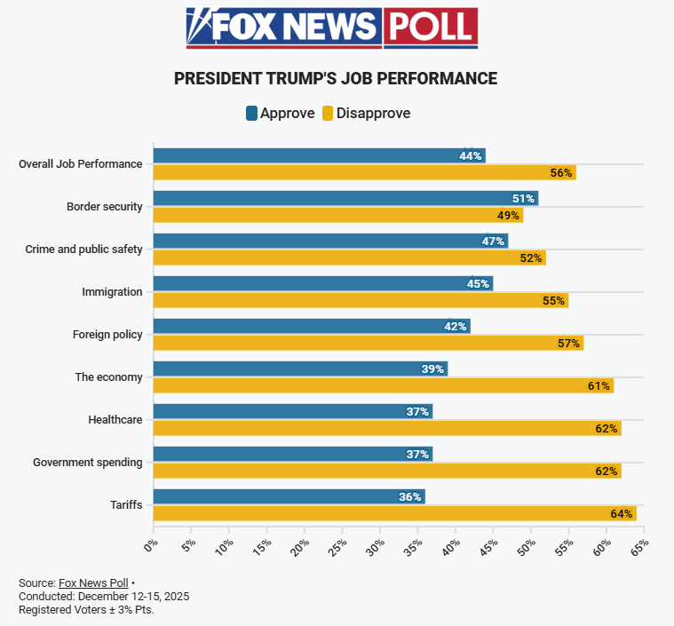 Fox News Poll: Voters sound alarm on healthcare costs Victoria Balara, Fox News • 86% of voters are extremely or very concerned about the price of healthcare, up 5 points since 2023. • Seven in 10 voters oppose eliminating vaccine requirements for children attending public school. • President Trump receives some of his lowest marks on healthcare, with 37% approving of the job he’s doing and 62% disapproving. His ratings are similar on government spending (37% approve, 62% disapprove) and tariffs (36%, 64%).