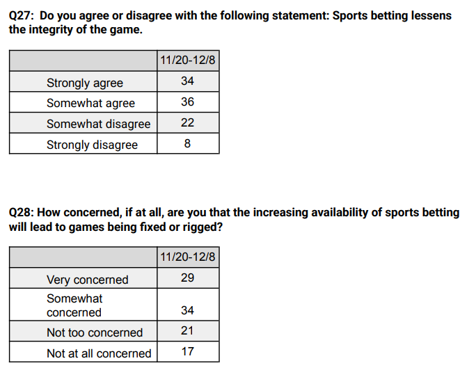 Americans fear sports betting is threatening the integrity of games David K. Li, NBC News In the NBC News Decision Desk Poll, 70% of respondents said betting is harming sports' integrity, and 63% worry about the potential for games to be rigged.
