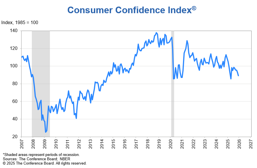 US Consumer Confidence Fell Again in December Conference Board Confidence weakened for a fifth consecutive month as perceptions of business conditions were negative, and apprehensions about jobs and income deepened