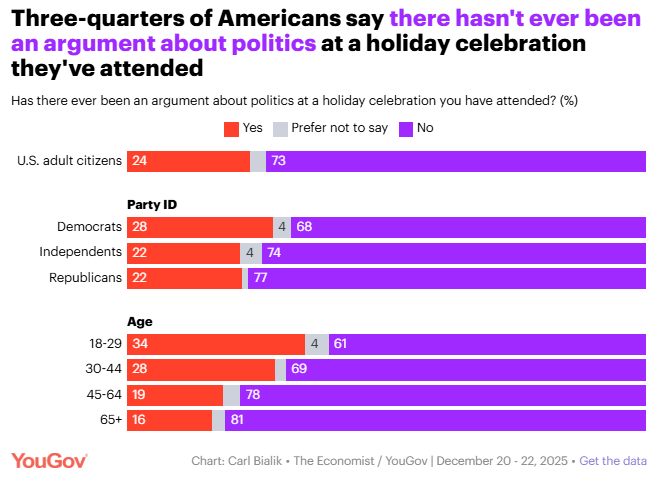 Most Americans have never had a political argument at a holiday celebration Carl Bialik, YouGov Only one-quarter of Americans have ever had a political argument at their holiday celebrations, and younger adults are far more likely than older ones to celebrate New Year's.
