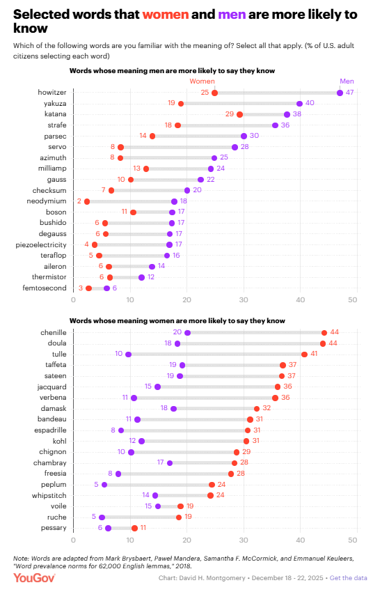 Howitzer, chenille, and other words that men or women are more likely to know David Montgomery, YouGov When social media users recently discovered a 2018 study about words with major differences in the shares of men and women who know them, one common response was incredulity about how anyone could not know one set of words. Or the other set. YouGov asked Americans to select words they knew the meaning of from a list including words the 2018 study identified as male- or female-skewing.