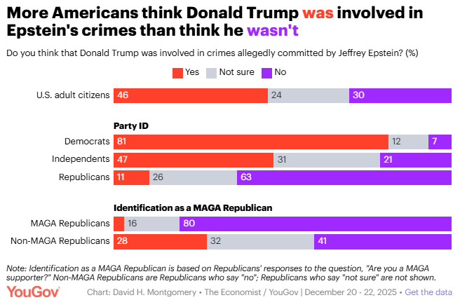 Less than half of MAGA Republicans strongly approve of Trump's handling of the Epstein investigation David Montgomery, YouGov The vast majority of Americans want the U.S. government to release all of its files from the investigation into Jeffrey Epstein: 81% say it should and only 4% say it shouldn't. Donald Trump's critics overwhelmingly oppose his handling of the Epstein investigation, while Trump's supporters are more divided and give him less support than they do on other issues.
