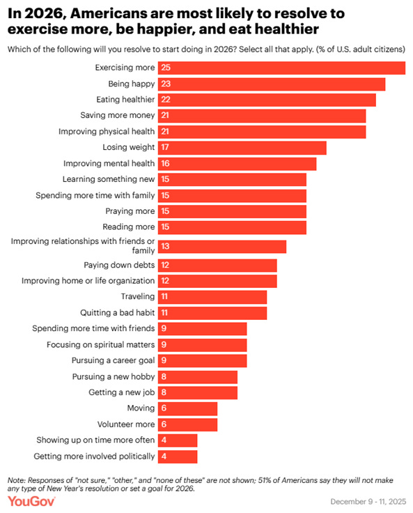 What are Americans’ New Year’s resolutions for 2026? Jamie Ballard, YouGov A new YouGov survey explored Americans’ New Year’s resolutions, their thoughts on 2025, and what they’re expecting for 2026.