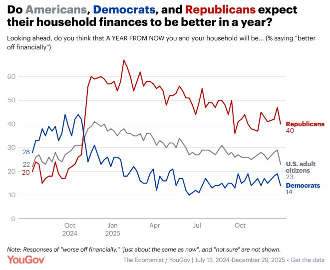 Americans' economic expectations of better things hit a low while anticipation of more of the same peaks Carl Bialik, YouGov Americans hit a 2025 low at the end of the year for their likelihood of expecting their household finances to be better in a year. That coincides with a high in the share who expect things to be about as they are now.