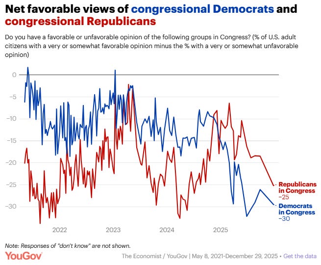 Why Does Trump Get Away With It? Thomas B. Edsall, New York Times [unlocked] How does Trump get away with doing things, repeatedly, that would have been disastrous for previous presidents — Republican and Democratic? In thinking about this question, I put together a long and constantly growing list of answers. They are not mutually exclusive but collectively complementary. Together, they are the ingredients for a stew of corruption. America’s 25 Years of Decline William A. Galston, Wall Street Journal [unlocked] Misgovernment has been the watchword for the first quarter of the 21st century. Trump Upended the Federal Government. The Full Scope of the Impact Is Still Unclear. Eileen Sullivan, New York Times [unlocked] President Trump achieved his goal of shrinking the work force. But many current and former officials say the government is less dependable and efficient than it was a year ago. The Separation: Inside the Unraveling U.S.-Ukraine Partnership Adam Entous, New York Times [unlocked] As President Trump sought a peace deal and Vladimir V. Putin sought victory, factions in the White House and Pentagon bled the Ukrainian war effort. The Lows of the Trump Administration’s Climate Onslaught Mark Gongloff, Bloomberg Opinion [unlocked] The government rolled back progress on the environment in at least 180 ways in 2025, and it’s just getting started. Four big things Congress did in 2025 — and how they could affect you Sahil Kapur, NBC News Republicans extended Trump's tax cuts, boosted spending for the Pentagon and immigration enforcement, repealed a record number of regulations and changed the Senate. The Most Exciting Races are Underway Jennifer Rubin, The Contrarian The 2026 midterms will be the most important of our lifetimes. The outcome will determine whether Donald Trump’s reign of terror continues unchecked, who will play critical roles in securing the 2028 presidential election, and which Democrats will be best positioned for the 2028 presidential race. After quiet off-year elections, Democrats renew worries about Trump interfering in the midterms Nicholas Riccardi, Associated Press If history is a guide, Republicans stand a good chance of losing control of the House of Representatives in 2026. They have just a slim majority in the chamber, and the incumbent party usually gives up seats in midterm elections. President Donald Trump, whose loss of the House halfway through his first term led to two impeachments, is trying to keep history from repeating — and doing so in ways his opponents say are intended to manipulate next year’s election landscape.