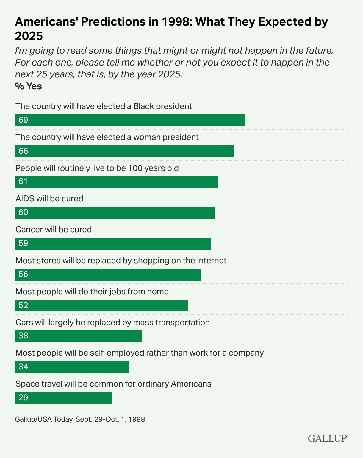 Gallup Vault: Futurecasting 2025 Had Mixed Results Mary Claire Evans and Lydia Saad, Gallup In 1998, Gallup conducted a special survey in partnership with USA Today to learn what Americans thought life would be like in the distant-sounding year of 2025.