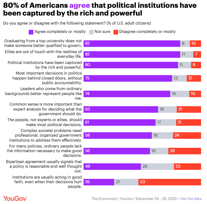 Distrust of elites, experts, and the establishment is widespread among Americans Taylor Orth, YouGov Democrats believe government institutions are necessary to effectively address problems; Republicans think government decisions should be driven more by common sense than by expert analysis.
