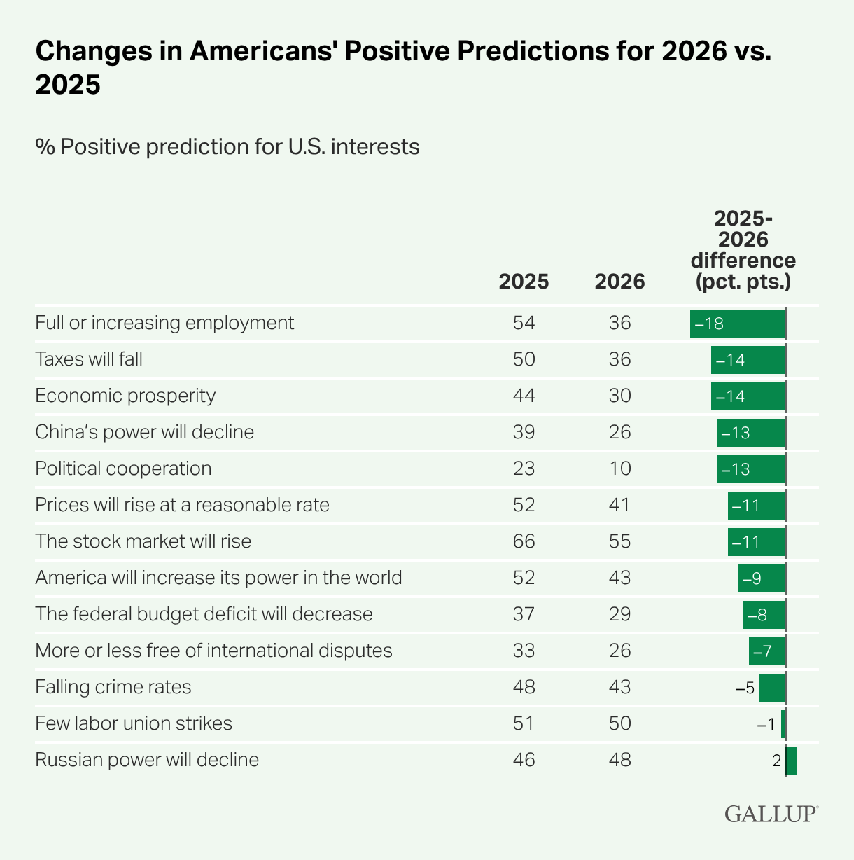 Americans Predict Challenging 2026 Across 13 Dimensions Megan Brenan, Gallup Americans head into 2026 expecting a difficult year, with majorities predicting negative outcomes across most economic, political and global measures, and only the stock market evoking optimism. Pessimism is heightened since last year and mainly reflects a decline in Republicans’ high expectations at the start of Trump’s second presidential term, though Republican supporters still largely believe good things will happen this coming year.