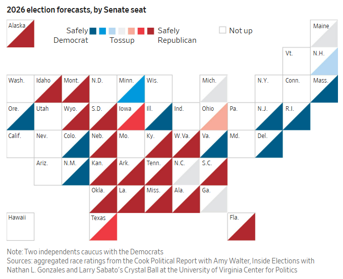 Americans do not want war with Venezuela G. Elliott Morris, Strength In Numbers Trump Is Turning to Venezuela but Voters Are Focused on the Economy Sabrina Siddiqui and Paul Kiernan, Wall Street Journal [unlocked] US intervention in Venezuela could test Trump’s ability to hold GOP together in an election year Steven Sloan, Associated Press Trump’s Move for Regime Change in Venezuela Threatens a New MAGA Rift Reid J. Epstein and Kellen Browning, New York Times [unlocked] How Trump’s foreign intervention could shake up the midterm elections Hannah Knowles, Washington Post [unlocked] Democrats Face Steep Climb to Reclaim Senate in 2026 Races Anvee Bhutani, Wall Street Journal [unlocked]