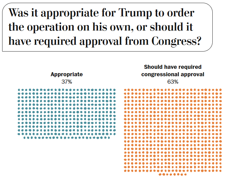 We texted 1,000 Americans about U.S. actions in Venezuela. Here’s what they said. Scott Clement and Eric Lau, Washington Post [unlocked] A Washington Post poll shows Americans are split on sending military forces to Venezuela to capture Maduro. Most say it should have required Congress’s approval.