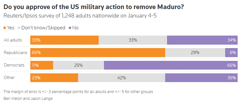 Americans have mixed reaction to the U.S. removal of Venezuelan president Alec Tyson, Annaleise Azevedo Lohr and Bernard Mendez, Ipsos Americans are split over U.S. military action in Venezuela to remove President Nicolas Maduro: 33% say they approve of the U.S. removing the Venezuelan president compared with 34% who disapprove and 32% who say they are not sure, according to a new Reuters/Ipsos poll fielded shortly after the U.S. capture of Maduro. While views of the action are mixed, Americans express caution over broader engagement in Venezuela.