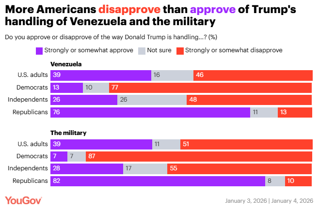 Surveys just after Maduro's capture show Americans are divided on U.S. military action in Venezuela Carl Bialik and Taylor Orth, YouGov Americans are deeply divided on the recent U.S. military action in Venezuela to capture Venezuela President Nicolás Maduro and take control of Venezuela and its oil industry, according to 27 questions asked of U.S. adults on a series of seven brief surveys in a 48-hour period immediately after Maduro was captured.