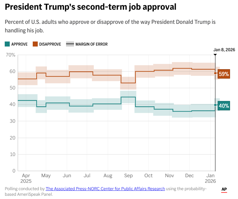 Trump has made ICE a 70-30 issue — for Democrats G. Elliott Morris, Strength In Numbers Minnesota Shooting: Political Rorschach Test Markschulman’s Substack Video Analysis of ICE Shooting Sheds Light on Contested Moments New York Times Democrats Will Lose in 2028 Unless They Change Course Now David Plouffe, New York Times [unlocked] Elizabeth Warren’s Abundant Mistakes Jonathan Chait, The Atlantic [unlocked] 24 members of Congress are 80 or older. More than half are running for re-election. Scott Wong and Joe Murphy, NBC News Democrats hope a blue wave washes over Wisconsin and gives them total control of battleground state Scott Bauer, Associated Press Senators worry that US Postal Service changes could disenfranchise voters who cast ballots by mail Claire Rush, Associated Press Democratic Bosses Are Launching a Remake of the 2028 Calendar Michael Scherer, The Atlantic [unlocked] Leading Prediction Firms Share a Commonality: Donald Trump Jr. Sharon LaFraniere, New York Times [unlocked] America’s Manufacturing Renaissance Is Missing in Action Scott Lincicome (Cato Institute), Bloomberg Opinion [unlocked]