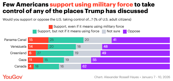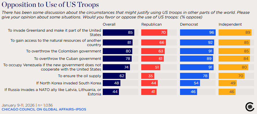 Americans Oppose Using Military Force to Take Greenland Dina Smeltz, Lama El Baz and Craig Kafura, Chicago Council on Global Affairs A new Chicago Council on Global Affairs-Ipsos survey, fielded January 9–11, 2026, finds the American public does not approve of Trump’s military forays. Majorities across partisan lines oppose using military force to invade Greenland, overthrow governments in Latin America, occupy Venezuela, gain access to another country’s natural resources, or expand the territory of the United States.