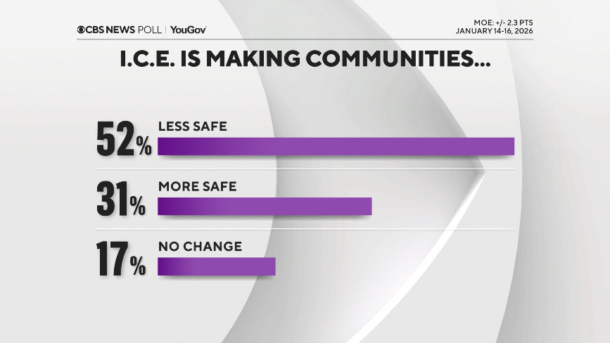 CBS News poll finds more Americans say ICE being too tough; Republicans feel protesters have gone too far Anthony Salvanto, Jennifer De Pinto, Fred Backus and Kabir Khanna, CBS News More Americans now describe ICE's operations as too tough when stopping and detaining people, and there's a growing view that President Trump's deportation program is targeting more people than just dangerous criminals. Meanwhile, Republicans overwhelmingly feel the protesters have gone too far.