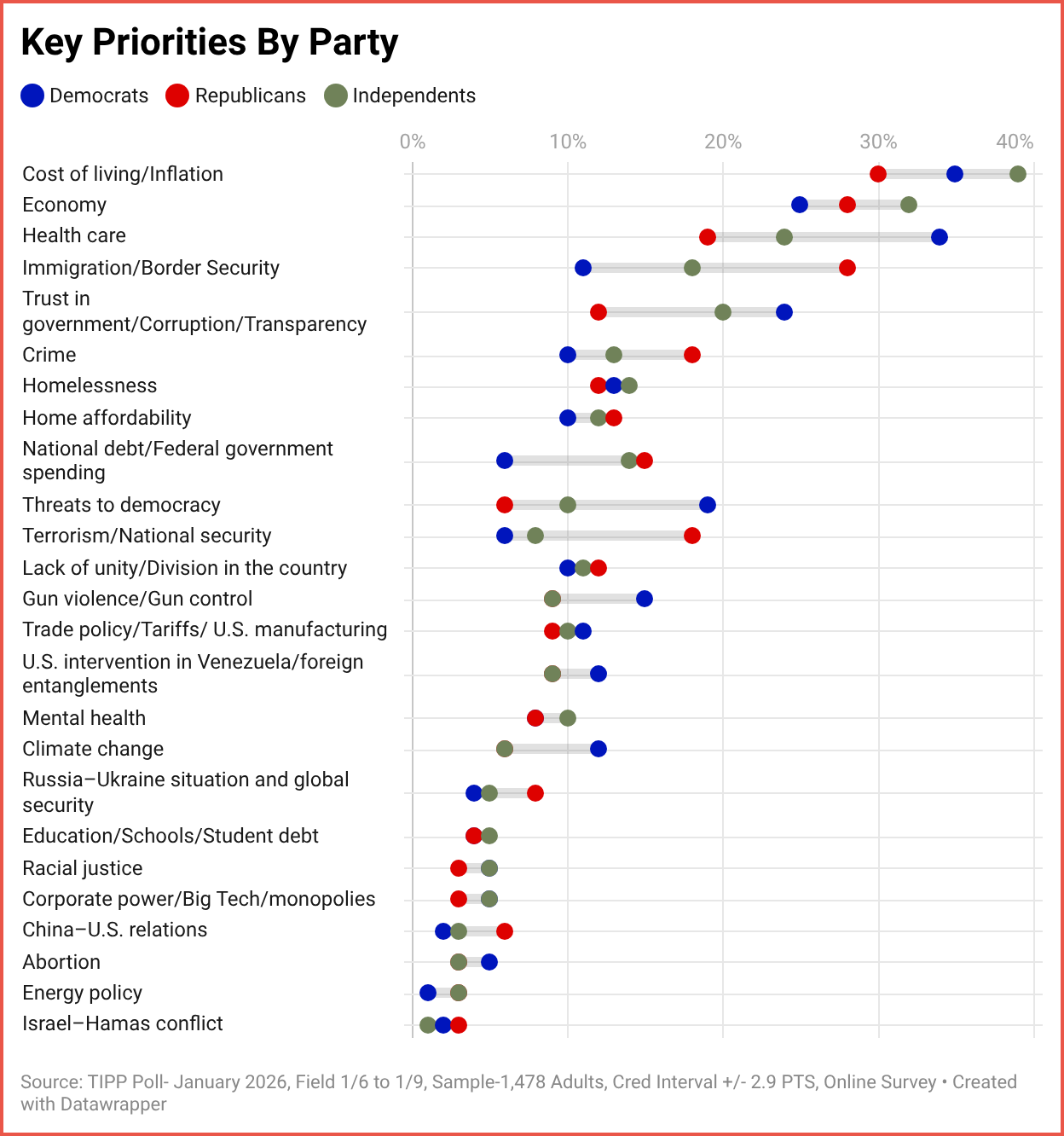 Voters Narrowly Support Maduro’s Removal But Don’t Want the U.S. to ‘Run’ Venezuela Vera Bergengruen, Wall Street Journal [unlocked] Americans are split on President Trump’s military operation that ousted Venezuelan strongman Nicolás Maduro, Wall Street Journal polling shows, as voters have grown more negative on Trump’s overall handling of foreign policy. The Nation's Pulse: Americans' Top Priorities And The Direction Of The Country tippinsights Despite sharp partisan differences in emphasis, voters across the political spectrum share a clear sense of urgency on economic strain and governance. These concerns are likely to shape the political landscape heading into the 2026 midterm elections.