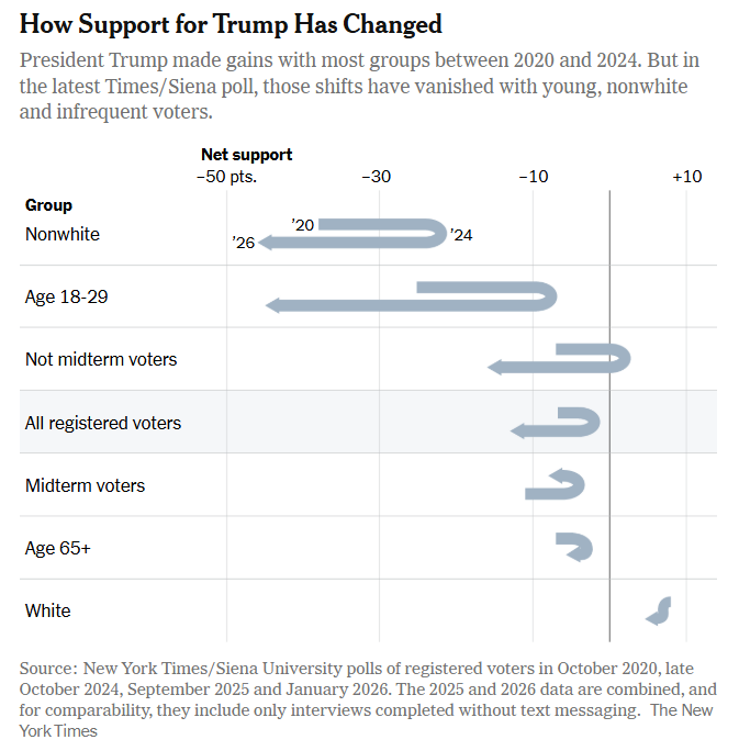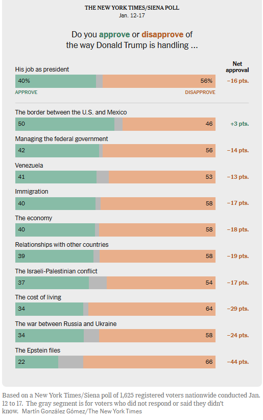 Donald Trump Is the New Joe Biden Blueprint Focus Group Report: Trump Regrets … They’ve Had A Few Julie Alderman Boudreau, Navigator Research New Hampshire: Sununu, Pappas Frontrunners in Senate Race; Ayotte Favored for Re-Election as Governor University of New Hampshire Survey Center North Carolina: The January Carolina Forward Poll Carolina Forward Utah governor urges balance as clash over immigration intensifies Brigham Tomco, Deseret News China Wins as Trump Cedes Leadership of the Global Economy Peter S. Goodman, New York Times [unlocked] Trump’s Greenland Gambit Has Broken Brains Across Washington Nahal Toosi, Politico Magazine How to Tell If Your President Is a Dictator Marc Novicoff, The Atlantic [unlocked] Is Trump Trying to Lose the Midterms? Karl Rove, Wall Street Journal [unlocked] Trump’s Norway Letter Proves This Isn’t Sustainable Jamelle Bouie, New York Times [unlocked] MAGA Delusions of Economic Leverage Paul Krugman A Year In, Trump’s Economy Is Worse Than the Numbers Alan S. Blinder (Princeton), Wall Street Journal [unlocked] The electorate’s inflation report card: January update David Winston (Winston Group), Roll Call Trump doesn’t care that you hate his immigration policy Philip Bump I’ve Covered Police Abuse for 20 Years. What ICE Is Doing Is Different. Radley Balko, New York Times [unlocked] Should Democrats Call for Abolishing ICE? Or Reforming It? Ed Kilgore, The Democratic Strategist You Can’t Denaturalize Me Carlos Lozada, New York Times [unlocked] The Government’s Posts Just Took a Sharp Far-Right Turn Ali Breland, The Atlantic [unlocked] There’s too much news for people—and polls—to keep up Natalie Jackson (GQR Research), National Journal [unlocked] Republicans’ Top Senate Recruit in Minnesota Says There Is Room for Her ‘Pro-Choice’ Politics Alex Roarty and Reese Gorman, NOTUS What women "don't know" Lakshya Jain, The Argument Ipsos to invest €1.2 billion over five years on AI, acquisitions Reuters
