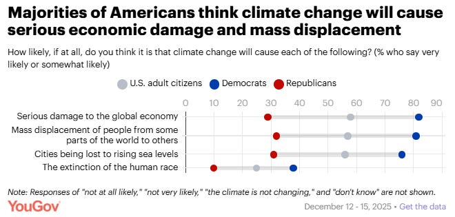 Americans are more likely to think climate change will be harmful to the world than to them personally Jamie Ballard, YouGov A new YouGov survey on climate change and the environment finds that many Americans foresee dire consequences to climate change and experience anxiety or grief when they think about climate change, but few believe they personally will be harmed greatly by climate change.