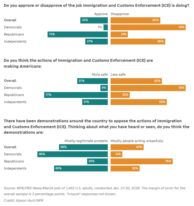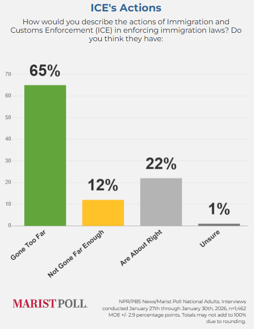 Two-thirds of Americans say ICE has 'gone too far' in immigration enforcement Domenico Montanaro, NPR News A new NPR/PBS News/Marist poll finds a jump in disapproval of the agency among Democrats and independents, but Republicans are standing by ICE and the president.