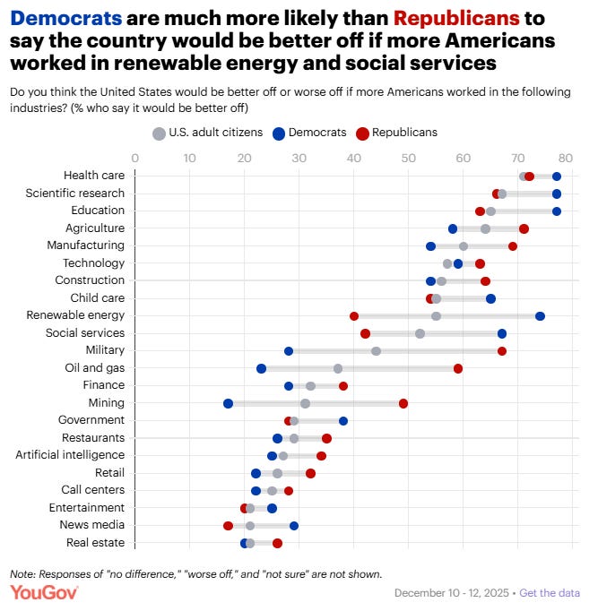 Republicans are more likely than Democrats to say the country would be better off if more people worked in the military and manufacturing Jamie Ballard, YouGov
