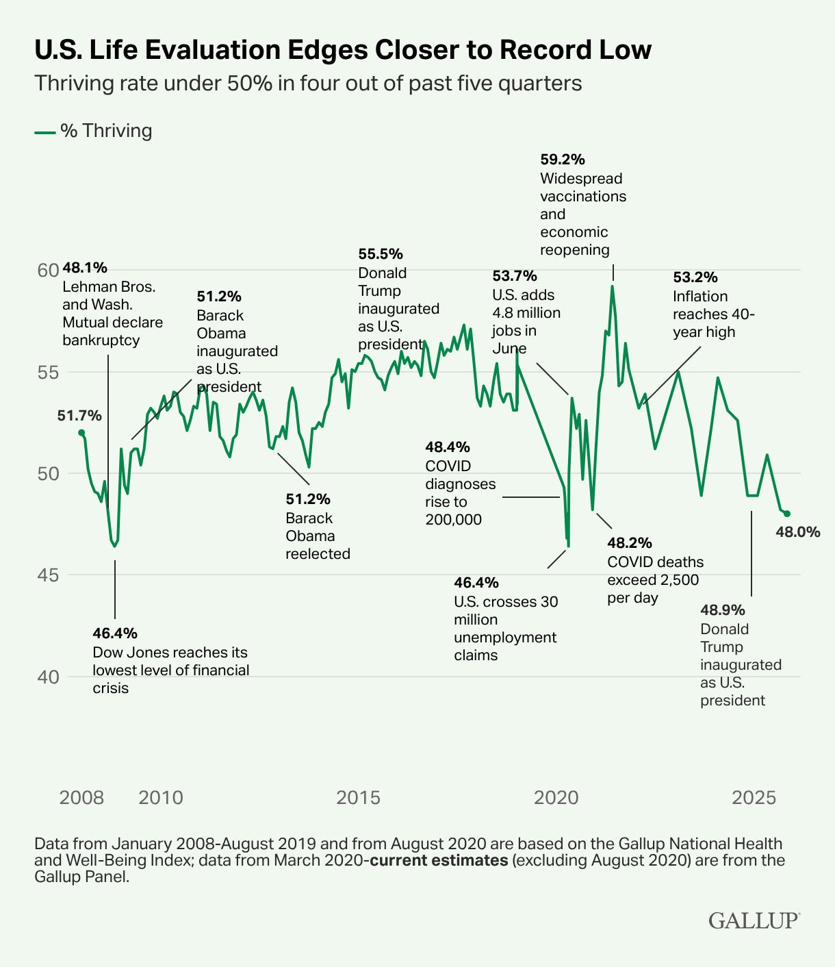 American Optimism Slumps to Record Low Dan Witters, Gallup The percentage of U.S. adults who anticipate high-quality lives in five years declined to 59.2% in 2025, the lowest level since measurement began nearly two decades ago. Americans’ ratings of their current lives have also declined since rebounding in 2021 but not as steeply as their future life ratings.