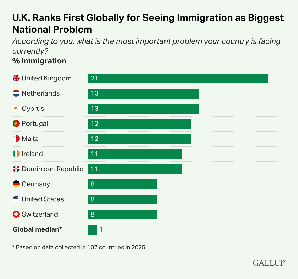 U.K. Leads World in Concern About Migration Benedict Vigers and John Reimnitz, Gallup The United Kingdom is more likely than any other country in the world to cite immigration as its top national problem. In 2025, just over one in five Britons (21%) named immigration as their No. 1 concern, statistically tied with mentions of the economy (23%). By contrast, immigration barely registers as a top issue elsewhere.