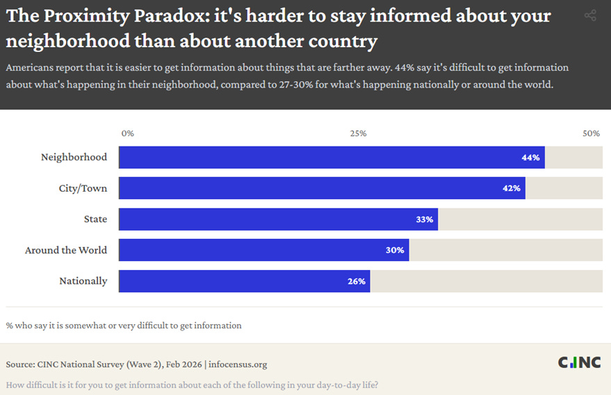 Americans Find It Harder to Get News About Their Neighborhood Than About the World Civic Information Needs Census Americans find it harder to stay informed about their neighborhoods, towns, and cities than about national and international news, according to a new study by the Civic Information Needs Census.