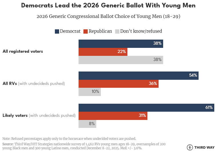 Where Do Young Men Stand Ahead of the 2026 Midterms? Lucas Holtz, Third Way In focus groups from last year, we found that Democrats have a significant challenge on their hands to reverse their slippage with young men, but neither party has cemented them as a reliable voter bloc. To further analyze where the young male electorate stands today, Third Way worked with HIT Strategies to conduct a nationwide mixed mode survey in December 2025 of 1,462 young men, 18 to 29 years old, who are registered to vote.