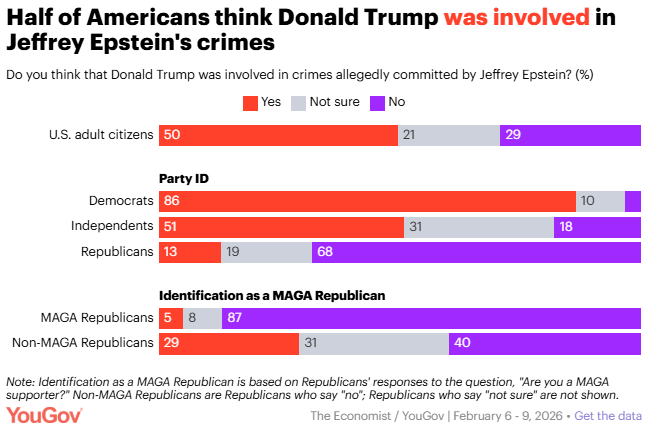 Half of Americans think Donald Trump was involved in Jeffrey Epstein's alleged crimes Taylor Orth, YouGov Most Americans are aware of the recent release of files relating to the case against Jeffrey Epstein, and more Americans disapprove than approve of how Donald Trump is handling the Epstein investigation. Half of Americans believe Trump is trying to cover up Epstein's crimes and a similar share believe he was personally involved in them.