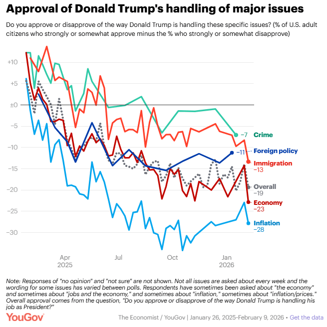 Net approval of Donald Trump's handling of the economy and immigration dip to second-term lows David Montgomery, YouGov Far more Americans disapprove than approve of Donald Trump's job performance. Immigration is one of the issues for which Americans are most likely to approve of Trump's job performance, but approval of his handling of immigration is at a record low.