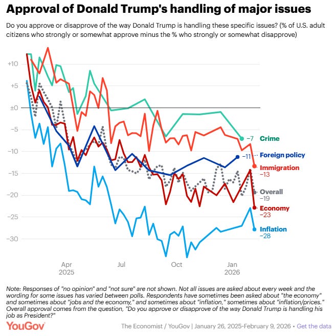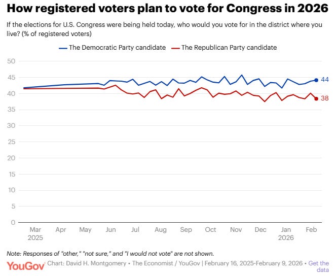 If Democrats are so unpopular, why are they winning? Charles Franklin, PollsAndVotes Discontent doesn’t mean defection How polls show Republicans shifted away from caring so much about Jeffrey Epstein Aaron Blake, CNN For years, conservative influencers and Republican politicians kept the flame lit when it came to pushing for more information about Jeffrey Epstein’s crimes. ... But as we were finally getting a big peek behind the curtain late last month, with the Justice Department releasing millions of pages of documents, there was an interesting dynamic. Conservatives didn’t care too much — at least relative to the left — and conservative TV didn’t cover it too much, new polling suggests. As Trump presidency enters second year, his voters share hopes – and concerns Julia Harte, Reuters Joyce Kenney is even happier with Donald Trump today than when she voted for him in 2024. “I would gladly vote for him any time,” said the 74-year-old retiree in Prescott Valley, Arizona. With Trump confronting nationwide protests against his immigration policies, mounting cost-of-living complaints, and tensions with countries from Denmark to Colombia, Kenney and 19 other Trump voters spoke to Reuters about what they want him to accomplish in the year ahead. Even Trump Can’t Go Back to the Future William A. Galston, Wall Street Journal [unlocked] To MAGA, the 1950s were a better time. But the White House can’t bring it back. Will Stephen Miller Cost Republicans the House and Senate? Dan Pfeiffer, The Message Box The cruelty, chaos, and incompetence of Miller's mass deportation dreams have mortally wounded Trump's political standing The GOP Is Panicking Over Noncitizen Voting. It’s Imaginary. Ed Kilgore, New York Magazine It’s hard to overstate the importance of the myth of mass noncitizen voting to the MAGA mind-set. It’s at the heart of the white-supremacist Great Replacement Theory, which claims nonwhite immigrants are taking over America via the ballot box. And it’s not just fringe voices pushing this myth. What the Crypto Crash Reveals About Trump's Power Will Gottsegen, The Atlantic [unlocked] The president’s support was never a guarantee of the market’s stability. Republican Cash Edge Threatens to Swamp Democrats in the Midterms Shane Goldmacher and Theodore Schleifer, New York Times [unlocked] “Donald Trump has 99 problems going into the midterms,” one Democratic strategist said. “But money ain’t one.” Checking in on the Democrats’ Senate Outlook Michael Baharaeen, The Liberal Patriot At the end of last year, we wrote about how the 2026 midterm environment was shaping up to be a good one for the Democratic Party. Despite this apparent momentum, however, one place that could still be a challenge for Democrats this November is the U.S. Senate. Members of Congress are fleeing the job at a historically high rate Bridget Bowman, NBC News Fifty-one House members and nine senators have decided not to run for re-election, the most retirements from Congress this century. As colleagues wind down their careers, Rosa DeLauro is staying put Daniela Altimari, Roll Call Connecticut Democrat evades retirement buzz with powerful gavel once more in sight Why Wisconsin’s voters are America's most valuable Andrew Howard, Politico A new initiative breaks down which zip codes have the most competitive elections in America. How to deal with the survey-taking AI agents that threaten to upend social science Folco Panizza, Yara Kyrychenko & Jon Roozenbeek, Nature Researchers need new bot-detection strategies that exploit the limits of human reasoning rather than AI weaknesses. America Isn’t Ready for What AI Will Do to Jobs Josh Tyrangiel, The Atlantic [unlocked] Does anyone have a plan for what happens next?