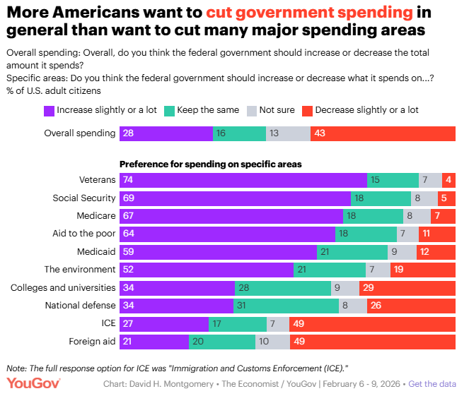 Few Americans want to increase overall government spending, but many support spending more in specific areas David Montgomery and Taylor Orth, YouGov Americans are more likely to support reducing federal spending in general than increasing it — but to support increased spending on each of a host of major budget areas, including Social Security, Medicare, aid to the poor, and national defense.