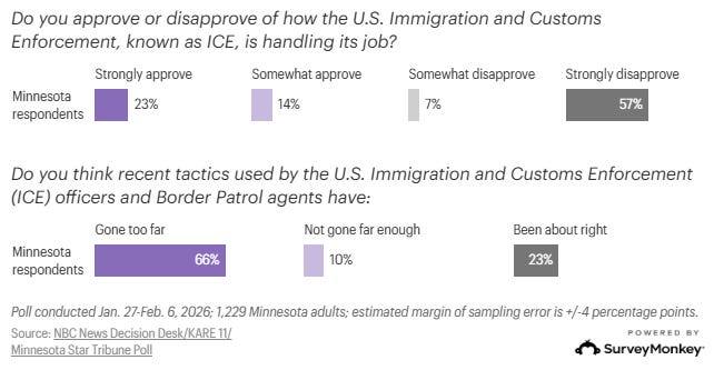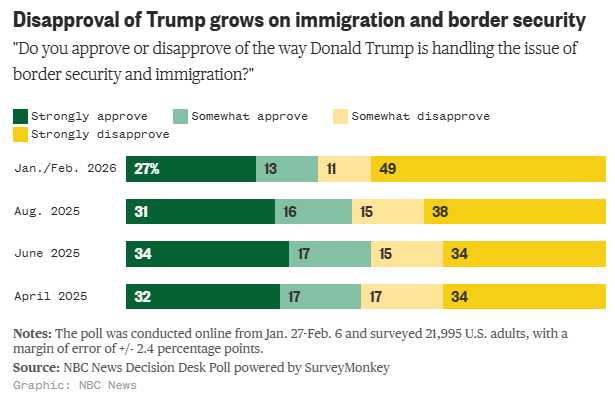 Trump's ratings on immigration tumble as Americans lose confidence in his top issue Natasha Korecki and Stephanie Perry, NBC News Support for President Donald Trump’s immigration agenda is in free fall in early 2026 after federal immigration agents shot and killed two Americans last month, according to the new NBC News Decision Desk Poll powered by SurveyMonkey. The administration’s aggressive tactics and deportation goals have dragged down Americans’ views of Trump on the very issue that helped sweep him into office, the survey shows.