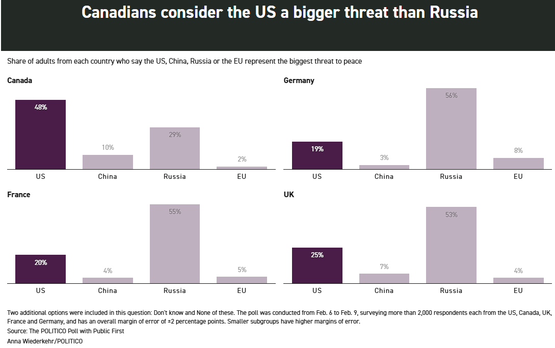 Look how much Canadians hate the United States now Nick Taylor-Vaisey and Anna Wiederkehr, Politico It’s not just about the trade war. Nearly half of America’s neighbors to the north now think the U.S. is a bigger threat to world peace than Russia.
