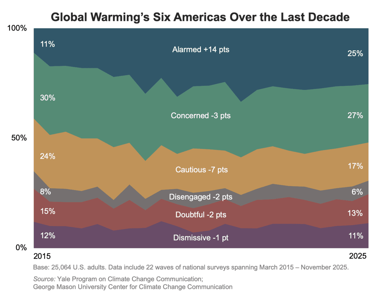 Global Warming’s Six Americas Yale Program on Climate Change Communication and the George Mason University Center for Climate Change Communication In 2009, we identified Global Warming’s Six Americas – the Alarmed, Concerned, Cautious, Disengaged, Doubtful, and Dismissive – six distinct audiences within the American public. Over the past ten years, the Alarmed have grown more than any other audience, from 11% in 2015 to 25% in 2025 (+14 percentage points). Conversely, the Cautious have decreased in size the most during that time, from 24% in 2015 to 17% in 2025 (-7 percentage points).