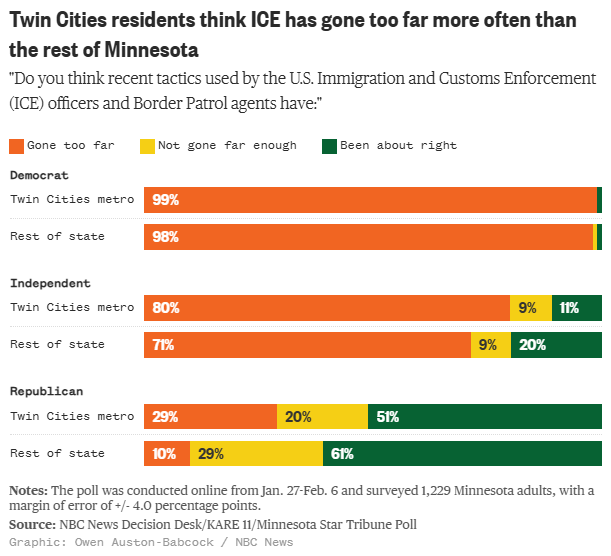 Immigration operations in Minnesota leave behind a more polarized populace Owen Auston-Babcock, NBC News Minnesotans were likelier to strongly approve and strongly disapprove of Trump and his immigration agenda than national adults after Renee Good and Alex Pretti were killed.