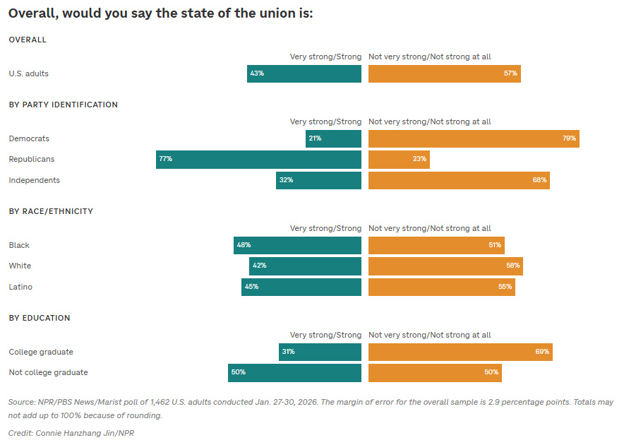 Most say the state of the union is not strong and the U.S. is worse off Domenico Montanaro, NPR News As President Trump is set to deliver his first official State of the Union address of his second term, most Americans say the country is worse off than a year ago and that the state of the union is not strong, according to the latest NPR/PBS News/Marist poll. Additionally, more people than ever are describing the direction Trump is moving the country as "change for the worse."