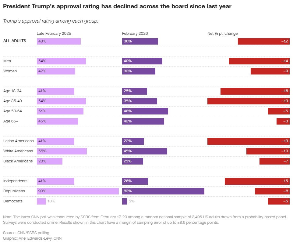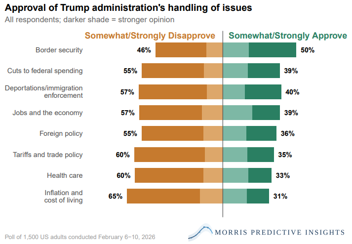 Michigan: Voters Unaware as Economic and Education Rankings Continue to Plummet Detroit Regional Chamber The Detroit Regional Chamber has released findings from its latest statewide poll of 600 registered Michigan voters in partnership with the Glengariff Group, Inc. While the poll covered the economy, data centers, the ability of Washington and Lansing to compromise, and the race to be Michigan’s next governor, voters’ misperceptions of how Michigan compares to other states indicate a major red flag for business, education, and government leaders. Virginians support tougher gun laws but doubt the impact Institute for Policy and Opinion Research, Roanoke College Most Virginians favor stricter gun laws, but many question their effectiveness, according to a new Roanoke College Poll. Residents also support the commonwealth’s existing method of redistricting and drawing legislative lines. Trump heads into the State of the Union facing diminished voter trust on the economy Sahil Kapur, NBC News Americans' trust in the president's handling of the economy has tumbled, depriving him of a valuable political asset he has held for a decade. Americans sour on Trump ahead of State of the Union, polls find Cheyanne M. Daniels, Politico New polls show the president’s approval rating falling among Democrats and independents, though it remains strong among Republicans. Trump Claims a Historic Turnaround for the U.S. Here Are the Facts. Ashley Cai and Linda Qiu, New York Times [unlocked] Trends on jobs, inflation and crime that began before Donald Trump retook office continued, largely unabated, in his first year back. Trump says he's kept all of his campaign promises. Our MAGA-Meter shows something different. Louis Jacobson and Amy Sherman, PolitiFact PolitiFact is tracking 75 of Trump’s second-term campaign promises on our MAGA-Meter.