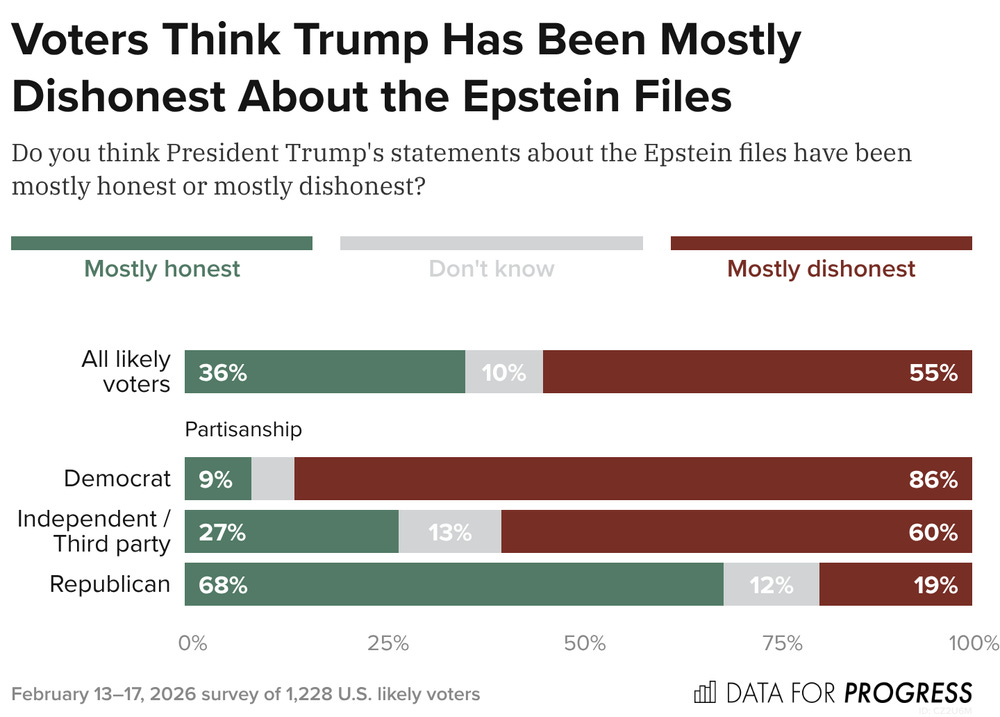 Voters Think Trump Has Been Mostly Dishonest About Epstein — and Find Attacks Against the “Epstein Class” Convincing Data for Progress A new Data for Progress poll finds that voters are hearing more about the Epstein files today than in 2025. In a survey from July 11-12 last year, only 25% of voters said they had heard “a lot” about the Epstein files, but today, that number has risen to 45%. When asked whether Trump has been mostly honest or dishonest about the files, a majority of voters say he has mostly been dishonest by a +19-point margin. This includes Independents by a +33-point margin.