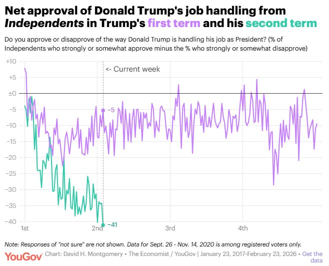 Two-thirds of Independents disapprove of Donald Trump's job performance David Montgomery, YouGov Far more Americans disapprove of Donald Trump's job performance than approve of it, as has been the case for most of Trump's second term. Democrats maintain an edge over Republicans in preference for the 2026 congressional elections.