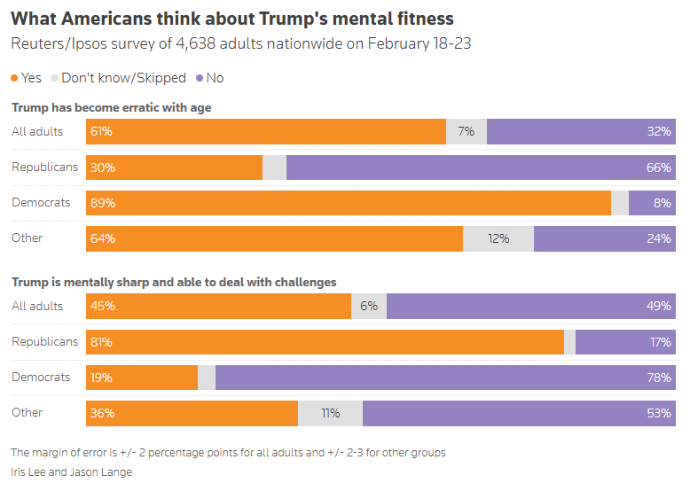 Immigration is Trump's best and worst issue: ABC News/Washington Post/Ipsos poll Emily Guskin, ABC News Depending on who you ask, immigration is either President Donald Trump's greatest accomplishment or his most significant failing since returning to office in January 2025. Most Americans say Trump is growing erratic with age, Reuters/Ipsos poll finds Jason Lange, Reuters Six in ten Americans, including a significant slice of Republicans, think President Donald Trump has become erratic as he ages, according to a new Reuters/Ipsos poll.