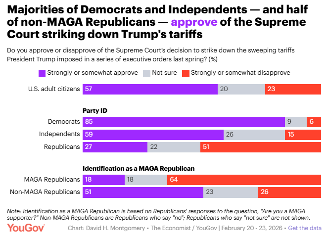 Majorities of Americans want lower tariffs and approve of the Supreme Court ruling against Trump's tariffs David Montgomery, YouGov Majorities of Americans approve of the Supreme Court's decision to strike down many of the tariffs Donald Trump imposed over the past year, think presidents should not be able to impose tariffs without congressional approval, and oppose Trump re-imposing tariffs using different laws.