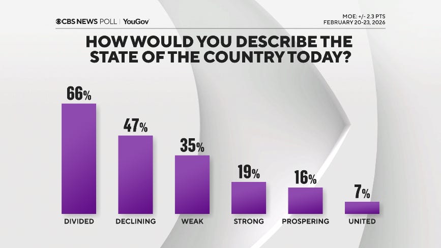 Trump’s State of the Union left some viewers unconvinced that he’ll lower cost of living, CNN poll finds Ariel Edwards-Levy and Jennifer Agiesta, CNN President Donald Trump’s State of the Union address drew largely positive marks from a heavily Republican audience, according to a CNN poll conducted by SSRS. But it didn’t fully convince significant shares of even that friendly audience that he’s focusing on the nation’s most important problems or that he’ll lower the cost of living. Poll on Trump State of the Union finds most want to hear about economy and say admin. hasn't explained Iran policy Anthony Salvanto, Jennifer De Pinto, Fred Backus and Kabir Khanna, CBS News Asked how they'd describe the country compared to a year ago, Republicans already think it is doing better today. And they're widely optimistic about the coming years ahead, too. A majority of Americans overall, though, feel the nation is doing worse.