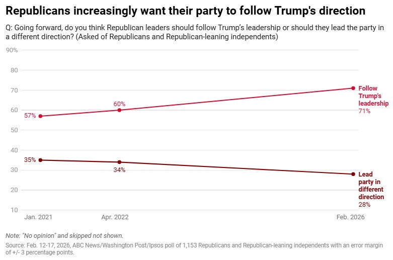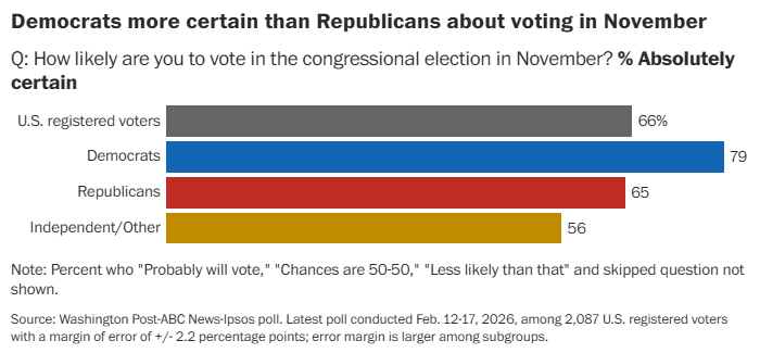 Most Americans see Iran as an enemy but doubt Trump’s judgment on military force, AP-NORC poll finds Linley Sanders and Stephanie Liechtenstein, Associated Press As the U.S. and Iran head into their next round of nuclear talks in Geneva, a new AP-NORC poll finds that many U.S. adults continue to view Iran’s nuclear program as a threat — but they also don’t have high trust in President Donald Trump’s judgment on the use of military force abroad. Republicans stare down epic voter enthusiasm gap ahead of 2026 midterms Liz Goodwin and Scott Clement, Washington Post [unlocked] The 14-percentage-point advantage is the Democrats’ largest in decades.