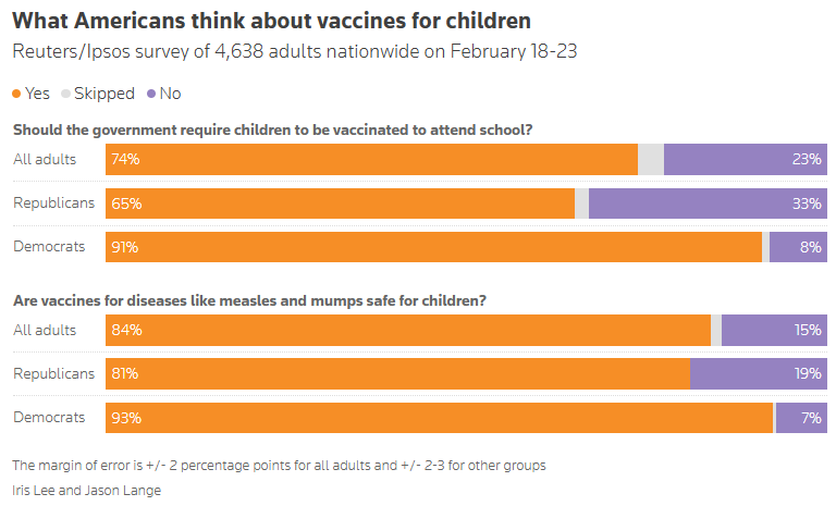 Americans trust vaccines, school mandates, rejecting Trump agenda, Reuters/Ipsos poll finds Leah Douglas and Jason Lange, Reuters A bipartisan majority of Americans believe vaccines are safe and that children should receive them to attend school, according to a new Reuters/Ipsos poll, illustrating the challenges President Donald Trump's administration faces to win broad support for upending decades of health policy.