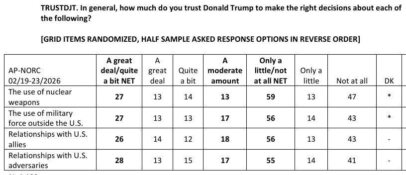 Trust in Trump’s decision making on the use of military force overseas is low AP-NORC Center for Public Affairs Research Fifty-six percent of the public has little or no trust in Trump’s judgment regarding the use of military force overseas. Still, 80% continue to be at least moderately concerned about the direct threat of Iran’s nuclear program to the United States.